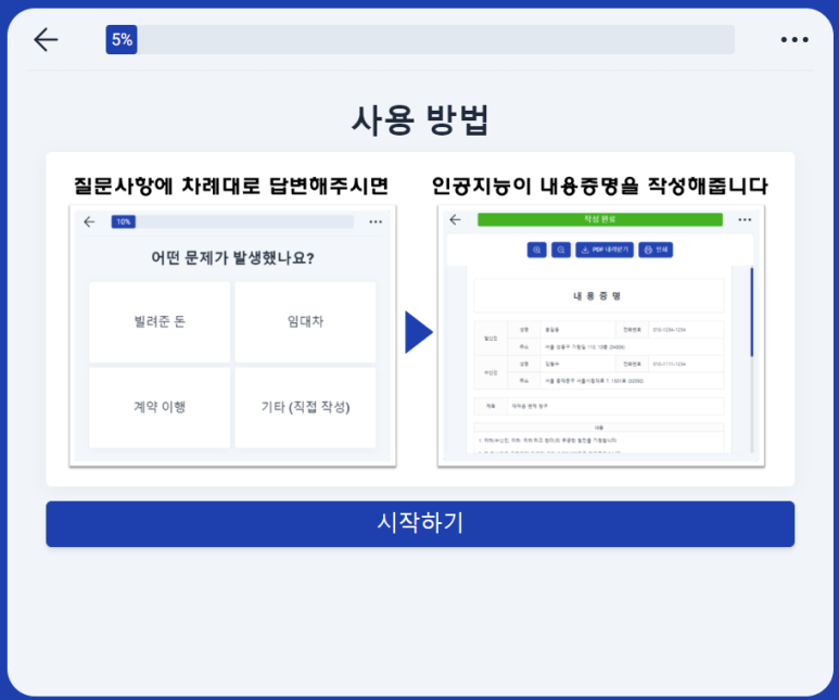 인공지능의 질문에 따라 답변을 하면, 무료로 1분만에 '육하원칙'과 '법률'에 맞게 인공지능이 내용증명을 자동으로 작성해줍니다.