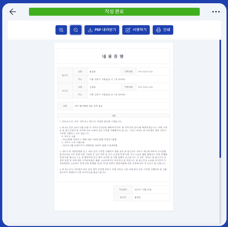 7. 참지마요로 1분만에 작성한 - 계약 불이행 조치 통보 내용증명